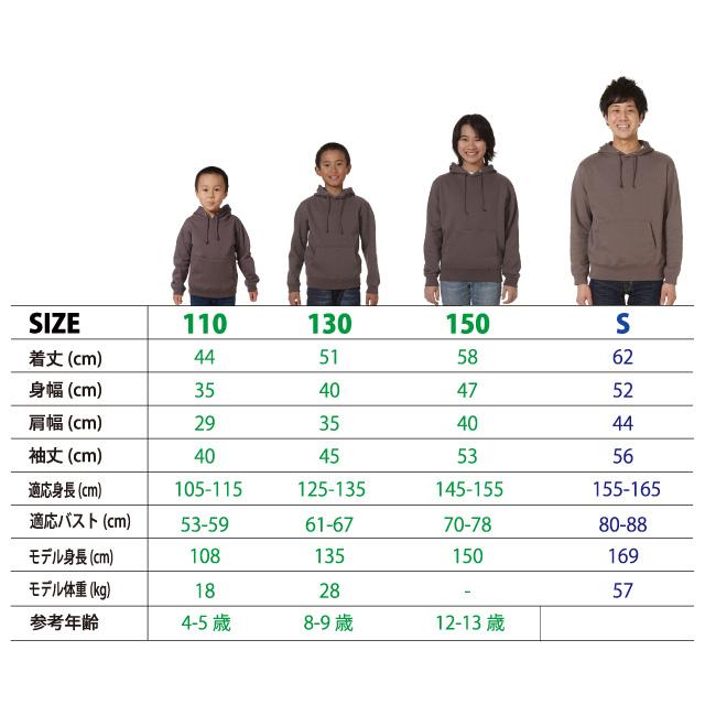 XXLは+650円、XXXLは+900円別途料金がかかります。110~150はフードひも無し。※一部カラーはSサイズ以上のサイズ展開です。XXXLはホワイト、ブラック、ミックスグレー、ネイビーのみ。