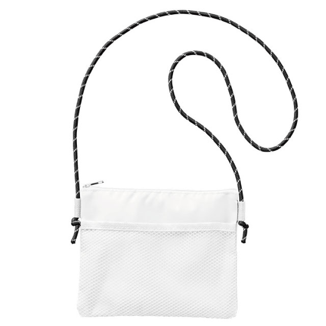 TR-1397 | MARKLESS STYLEメッシュポケットが付いたサコッシュです。旅行やライブへ行く際チケットなどを入れるのにぴったりなサイズで、ファスナー付きなので貴重品など安心して入れることができます。ひも部分は結び目の位置を変えることで簡単に長さ調節が可能。スポーティーなデザインで、アウトドアブランドや野外イベントのノベルティや物販用としてもおすすめです。おもて面へのプリントも可能!メッシュポケットをうら面側へひっくり返せば、ポケットの裏にプリントされたようなおしゃれな仕様になります。