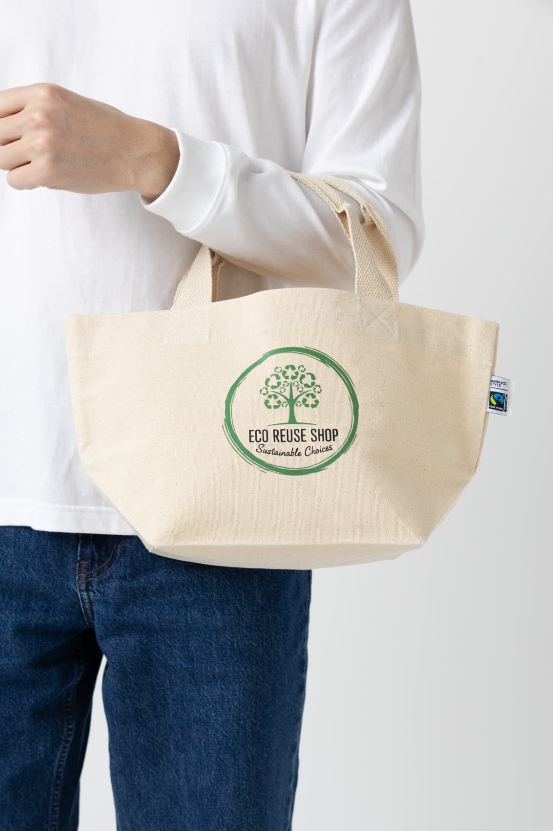 生地やひも、全ての素材にフェアトレード認証のオーガニックコットンを使用したバッグです。Sサイズはお弁当入れやちょっとしたお出かけにぴったり。持ち手が二つ折り縫製のため、手に馴染み持ち運びも楽々。スタイリングに迷わない優し気なカラーをご用意しました。どんな場面でもあなたのスタイルにマッチしてくれます。国際フェアトレード認証コットンラベルも付いているので、企業様のSDGs活動を通したイメージアップにも最適です