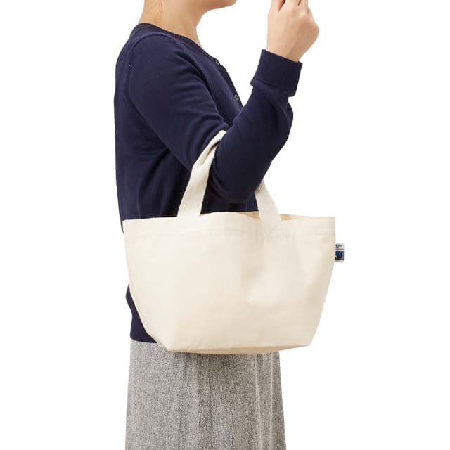 バッグ全ての部分にフェアトレード認証のオーガニックコットンを使ったバッグ。Sサイズはお弁当入れやちょっとしたお出かけにぴったり。持ち手は二つ折り縫製で持ちやすくなっています。スマートフォンや鍵など、バッグの中で迷子になりがちな小物を入れることができる内ポケットがついているので、使いやすさも抜群です。国際フェアトレード認証コットンラベルも付いているので、企業様のSDGs活動を通したイメージアップにも貢献すること間違いなしです。
