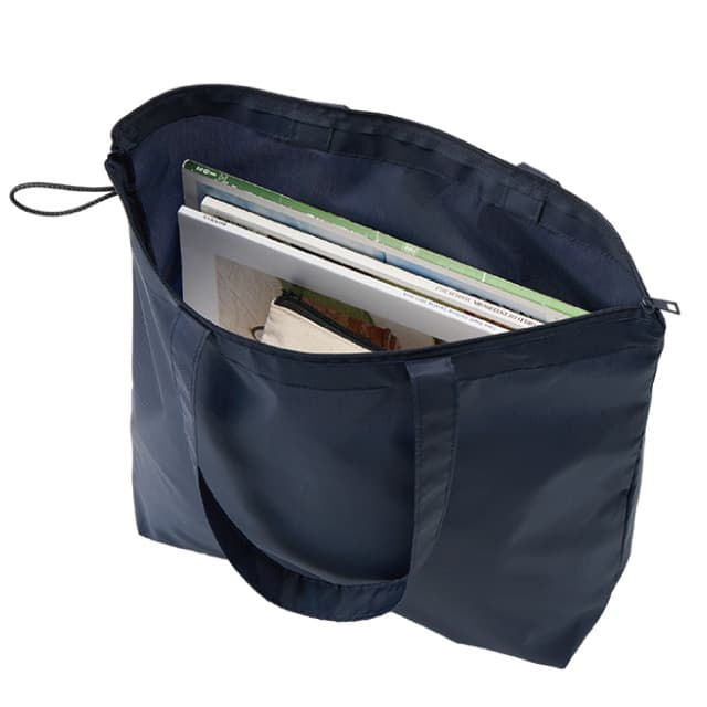 TR-1351 | MARKLESS STYLEファスナー付きで安心なポケッタブルトートバッグです。 コーティングを施しているため、耐久性があります。 たくさんお買い物をしたときや、荷物が多いときにもファスナーを閉めれば、 中身を見られることがなく、荷物が飛び出る心配もないため安心して使用することができます。 また旅行の際、サイドのゴムでコンパクトにまとめて持っておけば、 お土産など荷物が増えてしまったときにもサブバッグとして重宝します。 M・Lの2サイズ展開で、MサイズはA4サイズが横向きにきれいに収まるサイズ感です。